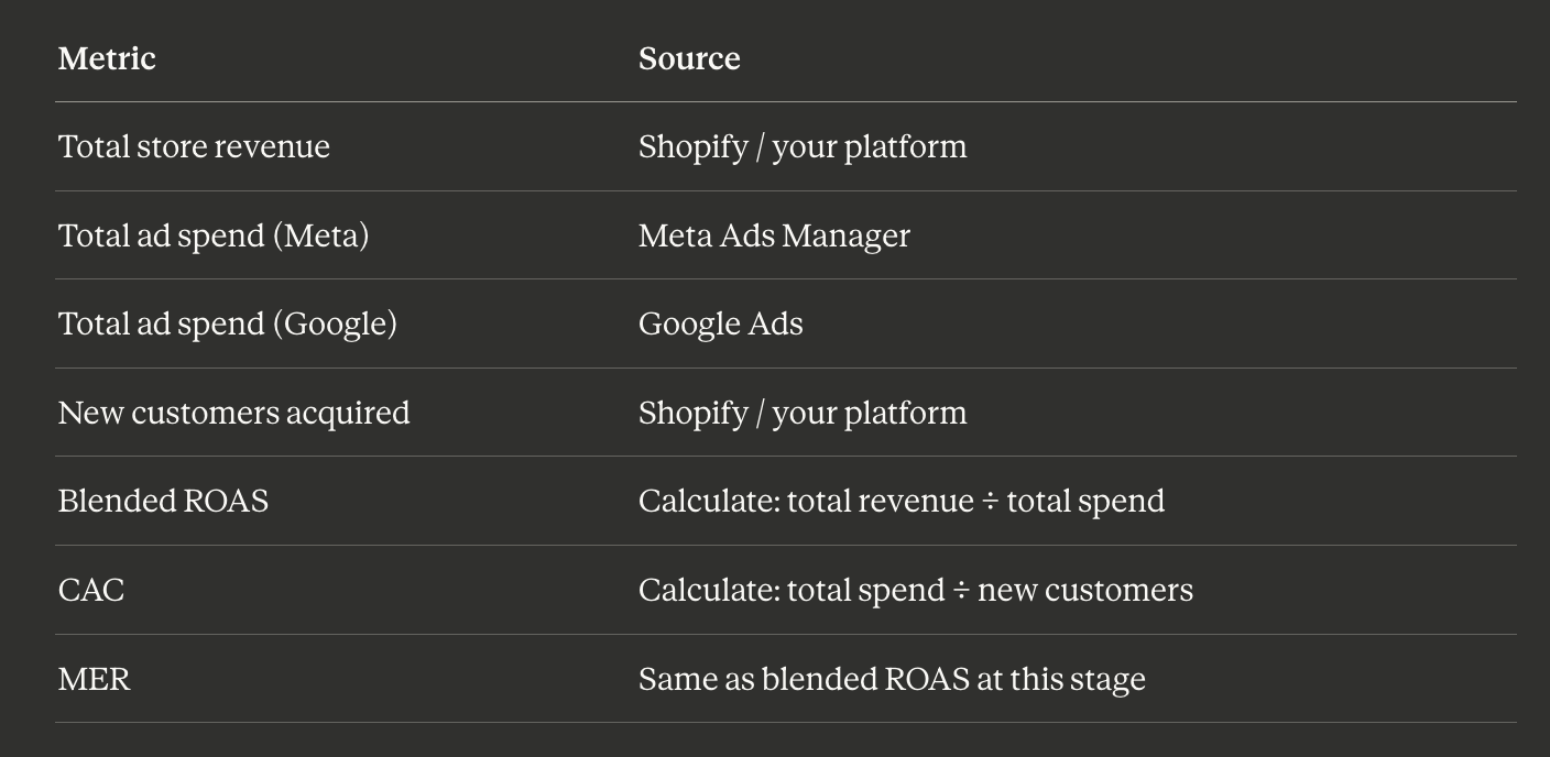 Run a blended view. Pull your total ad spend across Meta and Google, then divide it by your total store revenue for the same period. That's your blended ROAS or MER. It removes the attribution noise entirely.